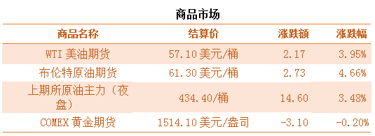 商品市场:截止收盘,WTI 9月原油期货收涨2.17美元,涨幅3.95%,报57.10美元/桶。布伦特10月原油期货收涨2.73美元,涨幅4.66%,报61.30美元/桶,创今年以来最大单日百分比涨幅。上期所原油期货1909合约夜盘收涨3.48%,报434.40人民币/桶。上期所原油期货1909合约夜盘收涨3.48%,报434.40人民币/桶。中美贸易会谈令风险情绪大为改观,同时美国推迟部分产品加征关税,这令原油多头大受鼓舞。美国WTI原油期货价格盘中最高触及57.47美元/桶,布伦特原油期货价格盘中最高触及61.50美元/桶。