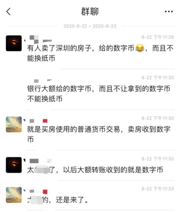 聊天内容显示:"有人卖了深圳的房子,银行大额转账给的数字货币,且不能换纸币,就是买房使用的普通货币交易,卖房收到数字币。"