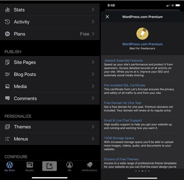 WordPress.com 还开发了 WordPress iOS 应用,该应用可以让用户免费创建和管理基于WordPress的网站,无论他们是否向 WordPress.com支付高级域名费用。