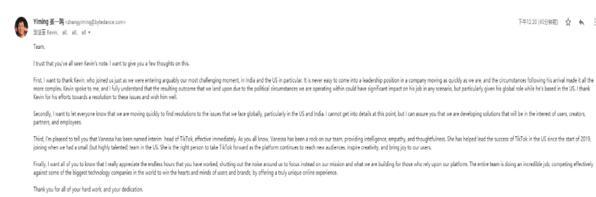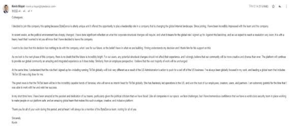就在8月27日中午12:14 TikTok首席执行官凯文·梅耶尔在内部发了一封辞职信,信中提到:"近几周,因为宏观环境突变,公司可能需要因此作出一些结构调整,同时我的岗位会受到影响,我深深思考了一番,我决定离开",此时距离其正式执掌TikTok全球业务仅87天。