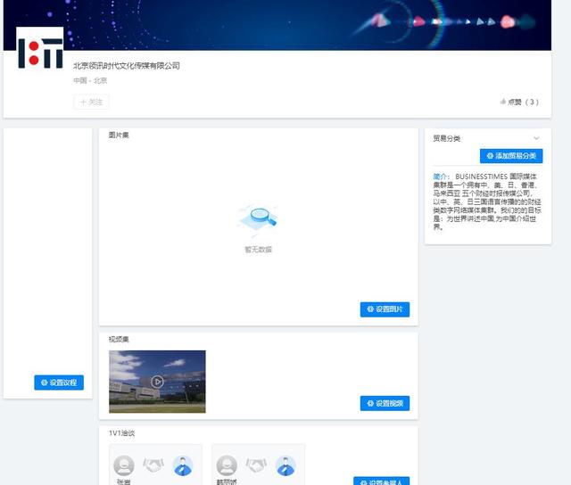 □ 登进入本企业店铺页面,可设置扸、视频、参展人和企业简介等