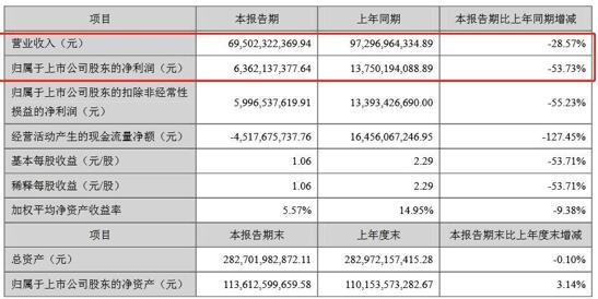 根据格力在8月30日发布的半年报,其上半年营收为695亿元,同比下滑28.57%;归母净利润为63.62亿元,同比下滑53.73%,缩水超过一半,且净利润率为9.24%,同比下滑34.89%。