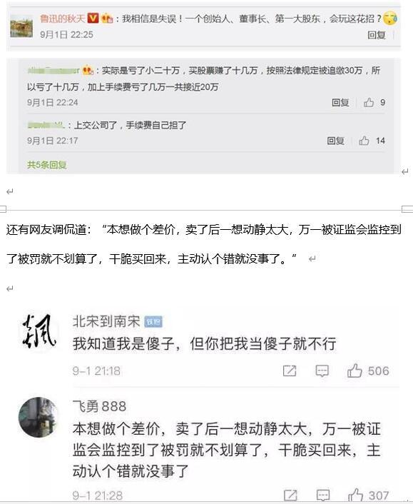 不过,也有网友评论道:"我相信是失误,一个创始人、董事长、第一大股东,会玩这花招?""实际是亏了小二十万,买股票赚了十几万,按照法律规定被追缴三十万,还得自己承担手续费"。