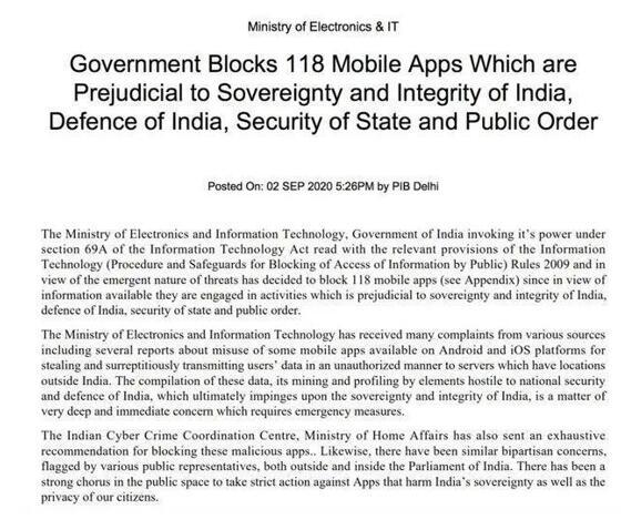 MEIT还声称,他们收到投诉,称这些应用"以未经授权的方式窃取和秘密传输用户数据到印度境外的服务器上"。公告中如此解释说:"这些数据的汇编、对印度国家安全和国防怀有敌意的人对其进行挖掘和分析,最终侵犯了印度的主权和完整,这是一个非常深刻和紧迫的问题,需要采取紧急措施。"