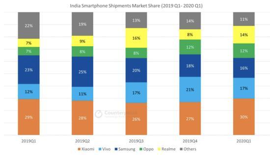 此外,有数据公司统计,在印度,中国手机公司市占率超过70%,三星拿不到 20%的市占率,而印度本土公司的份额只有不到5%。