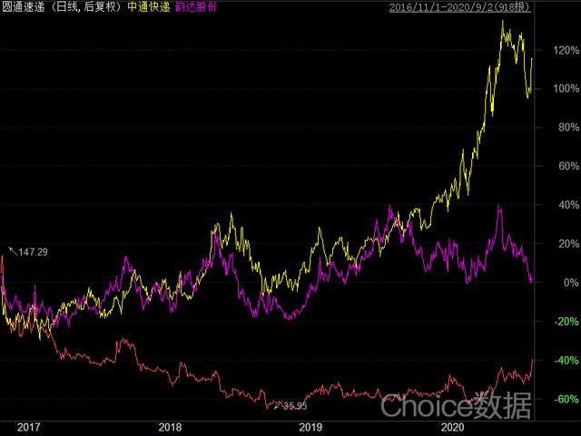 而A股投资者对于炮灰的命运一向非常现实,纷纷选择用脚投票:圆通从2016年年底落后行业之后,股价最多跌幅高达60%,而确定行业头名位置的中通股价则一路绝尘。