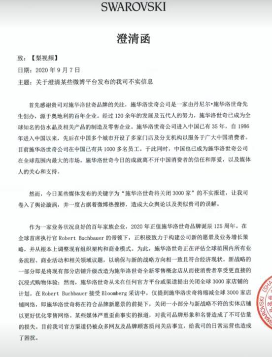 不过,就在这一消息发出后晚些时候,官方即刻澄清,表示网上关于"施华诺世奇将关闭3000家店铺的报道系不实报道"。CEO罗伯特·布赫鲍尔(Robert Buchbauer)在接受媒体的采访中,仅提到施华洛世奇将缩减全球3000家店铺网络,即关闭一小部分与新战略不符的实体店铺,以更好优化零售网络。