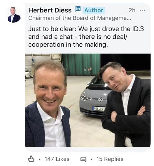 然而,大众却否认了同特斯拉的"暧昧"关系。迪斯在社交媒体上明确回应了绯闻:"我们只是试驾了ID.3,没有任何交易或合作正在酝酿中" 。