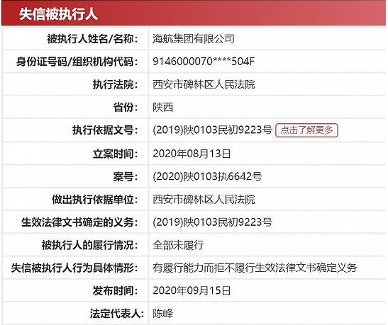 9月15日,据中国执行信息公开网披露,海航集团被列入失信被执行人名单,执行法院为西安市碑林区人民法院,该失信被执行人信息显示,海航集团有履行能力而拒不履行生效法律文书确定义务,履行情况为"全部未履行"。