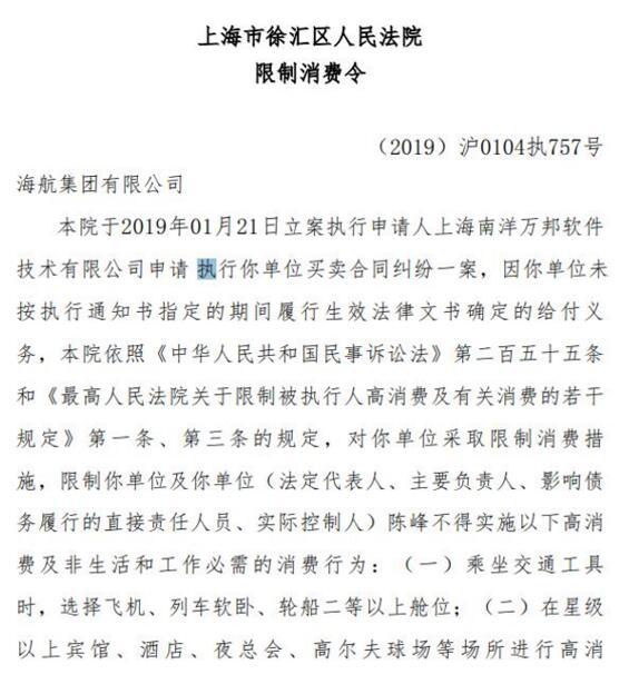 法院将海航集团列为"失信公司"后,随即对海航集团及其董事长陈峰下发了限制消费令,限制海航集团及法定代表人陈峰不得实施高消费及非生活和工作必需的消费行为,其在乘坐交通工具时,不得选择飞机、列车软卧、轮船二等以上舱位,且不能在星级以上宾馆、酒店、夜总会、高尔夫球场等场所进行高消费。