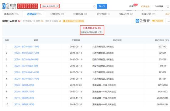 实际上,海航集团接到的类似执行案件并不在少数,据企查查显示,截至目前,海航集团有12条被执行人信息,被执行总金额超8.3亿元。