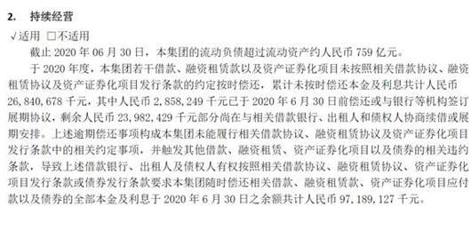 截至2020年6月30日,上述借款逾期行为触发了相关违约条款,导致借款银行、债权人等有权按照相关协议的条款要求本集团随时偿还借款、融资租赁款、资产证券化项目应付款以及债券的全部本金及利息共计971.89亿元。
