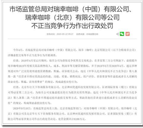 今年4月,瑞幸咖啡大规模财务造假事件爆出,引发国内外市场震荡。9月22日,发酵了五个月的瑞幸事件终于迎来了第一个处理结果:包括瑞幸咖啡(中国)公司、瑞幸咖啡(北京)公司、北京车行天下咨询服务有限公司等45家涉案公司予以行政处罚6100万元。