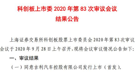 9月28日晚间,上交所披露科创板上市委2020年第83次审议会议结果,同意吉利汽车科创板首发上市,这标志着吉利汽车回归A股之旅成功地迈出了关键性一步,同时这也意味着吉利汽车距离正式登陆科创板只有一步之遥。