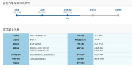 从9月1日科创板IPO申请获受理到本次过会,吉利汽车共计用时28天,仅次于此前蚂蚁集团的25天和中芯国际在6月份的19天用时。