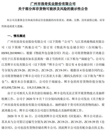 9月27日晚间,广州市浪奇实业股份有限公司(以下简称"广州浪奇")突然发布一则《关于部分库存货物可能涉及风险的提示性公告》,直指其在江苏鸿燊物流有限公司(以下简称"鸿燊公司")、江苏辉丰石化有限公司(以下简称"辉丰公司")共拥有合计账面价值达5.72亿元的存货物"不翼而飞"。
