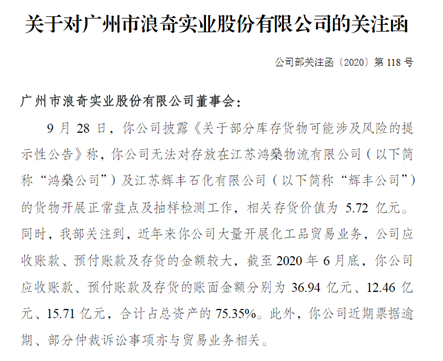 这场罗生门也引起了深交所的关注,9月28日上午,深交所发布关于对广州市浪奇实业股份有限公司的关注函,要求广州浪奇说明与鸿燊公司、辉丰公司关于第三方仓储业务的开展情况,包括但不限于合同签署时间、双方主要权利义务、合同执行情况及历史合作情况等,说明本次存货异常情况的具体发现过程及最新核查进展,全面核查是否存在其他存货异常情形。