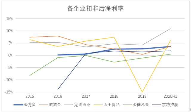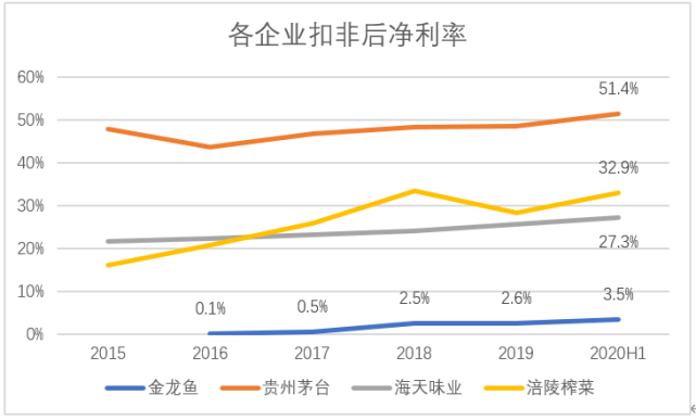 从2015年至2020年上半年各企业归属于上市公司股东的扣除非经常性损益的净利率(扣非后净利率)来看,金龙鱼最高只有3.5%,而茅台最新一期已经高达51.4%。