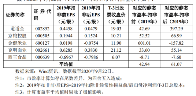 从上图中可以看出,2016至2020年上半年,金龙鱼的扣非后净利率持续稳定上升。扣非后净利率前期高于金龙鱼的道道全该指标基本呈下降趋势,西王食品因2019年商誉减值净利润为负,克明面业的净利率相对稳定。 根据金龙鱼招股说明书,5家可比企业截至9月22日的扣非后静态市盈率平均值为61.07。凭金龙鱼扣非后净利率的稳定程度和发展趋势,叠加金龙鱼巨大的体量,上市后市盈率达到行业平均的61.07相对合理,对应市值超过2700亿元。
