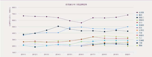 从基本面看,金龙鱼的优势更加明显。 根据2020年中国品牌力指数(C-BPI)食用油品牌排行榜,金龙鱼位居第一,遥遥领先于后面几名。金龙鱼旗下的另一个品牌胡姬花也榜上有名,且近十年得分呈上升趋势,2020年排名第四。在面粉品牌和大米品牌排行榜中,金龙鱼同样居首位。
