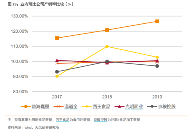 对产业链的全覆盖让金龙鱼能将原料的价值"吃干榨净",不浪费任何一个获利的机会,不断提高产品附加值;金龙鱼能参与到产业链每一个环节的生产,为其日后继续提高原材料利用效率、开发新产品打下基础。而对高中低端产品的全覆盖使金龙鱼在全社会阶层都树立起良好的品牌形象,无惧对手的下沉策略或产品升级策略。 天风证券研究所研究结果表明,2017-2019年,益海嘉里金龙鱼的产销率为业内可比公司最高,维持在110%以上且持续上升,说明市场对金龙鱼产品的认可度越来越高,库存商品数量下降。