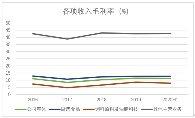 虽然目前销售价格相对便宜的油种,如大豆油、食用调和油、菜籽油等依然占据小包装食用植物油的主要部分,销售量占比超过80%,但因人们关注点和烹饪方式的改变,高端食用油迎来爆发只是时间问题。 此外,2015年,金龙鱼和中国台湾丸庄食品合作,将丸庄酱油引入中国大陆。金龙鱼此举可以被视作日后推出自己酱油品牌的前兆。毕竟酱油产品的壁垒更高,市场估值也更高,而自己的老对手鲁花已经开始生产酱油也使金龙鱼扩展该品类可能性极大。益海嘉里还尝试在日化领域从原料供应商转变为商品生产商,旗下日化品牌"洁劲"已经在2017年上市,产品线包括洗衣皂、洗衣液和洗洁精。这些日化产品都以有只为原料,延长了金龙鱼现有的油脂生产线。 金龙鱼各项收入毛利率中,其他主营业务毛利率显著高于厨房食品、饲料原料及油脂科技。其他业务有望成为下一个利润增长点,整体提升其毛利率。