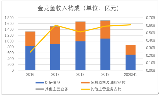 然而,虽然尝试的方向正确,金龙鱼离成功还有一段路要走。日化产品、酱油等调味料已经有了自己领域的霸主,金龙鱼想要分一杯羹并不容易。其他主营业务收入在金龙鱼总营收中占比始终不足1%,对公司业绩的影响几乎可以忽略不计。
