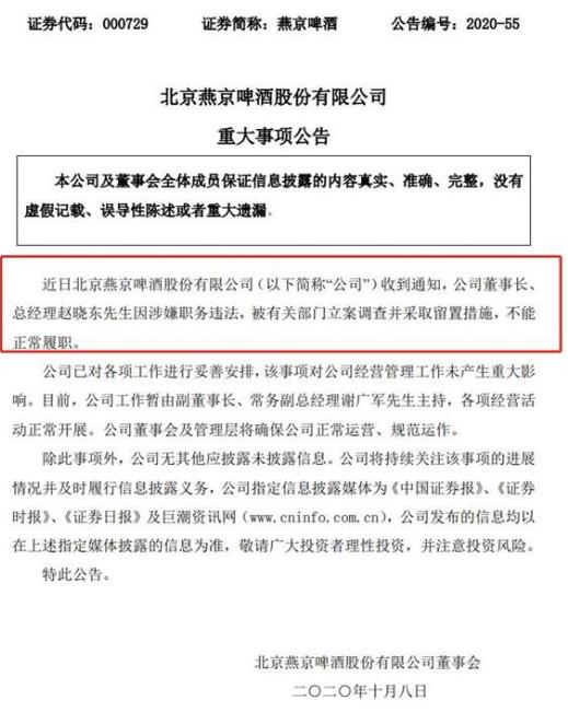 10月8日晚间,知名啤酒企业北京燕京啤酒股份有限公司(以下简称"燕京啤酒")发布公告称,其董事长、总经理赵晓东因涉嫌职务违法,被有关部门立案调查并采取留置措施,不能正常履职,目前,公司工作暂由副董事长、常务副总经理谢广军先生主持,各项经营活动正常开展。
