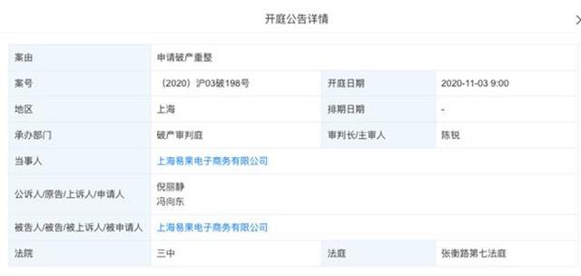 同时,易果生鲜CEO张晔证实,该公司的确已经进入破产重整,正在重组过程中,目前已经有确定的重组方,但是,对于具体的细节他并没有透露更多,确实,据天眼查显示,上海易果电子商务有限公司已经向上海市第三中级人民法院申请破产重整,已于2020年11月3日开庭。