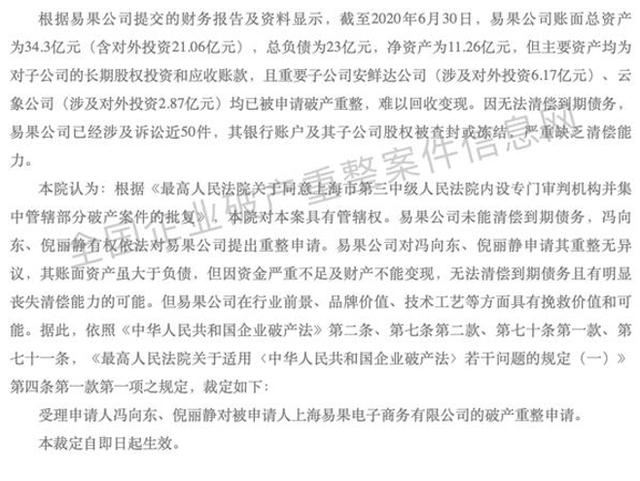 根据"破产审查案件"裁定文书显示,截止2020年6月30日,上海易果电子商务有限公司账面总资产为34.3亿元(含对外投资21.03亿元),总负债为23亿元,净资产为11.26亿元,但主要资产均为对子公司的长期股权投资和应收账款,且重要子公司安鲜达巩乃斯(涉及对外投资3.17亿元)、云象公司(涉及对外投资2.87亿元)均已被申请破产重整,难以回收变现。