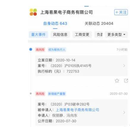 另外,10月14日,易果生鲜主体公司上海易果电子商务有限公司成为被执行人,执行法院为上海市长宁区人民法院,执行标的为722753元,此外,其全资子公司云象供应链和安鲜达已于7月30日进入自愿破产重组。