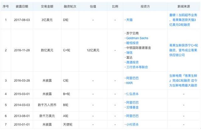 曾先后完成7轮融资,累计超59.3亿元,一直处于生鲜电商第一梯队,2013年获得阿里数千万美元A轮战略投资,2014年阿里巴巴联合云峰进行B轮投资,后获得天猫生鲜区独家运营权,不仅如此,易果生鲜在2016年11月28日又获得由苏宁、私募巨头KKR、高盛、瑞信等青睐,其中苏宁领投C轮融资,易果生鲜运营其线上生鲜品牌"苏鲜生",同时为苏宁小店供货,2017年8月,易果生鲜再获得天猫3亿美元D轮融资,此后便无融资消息。
