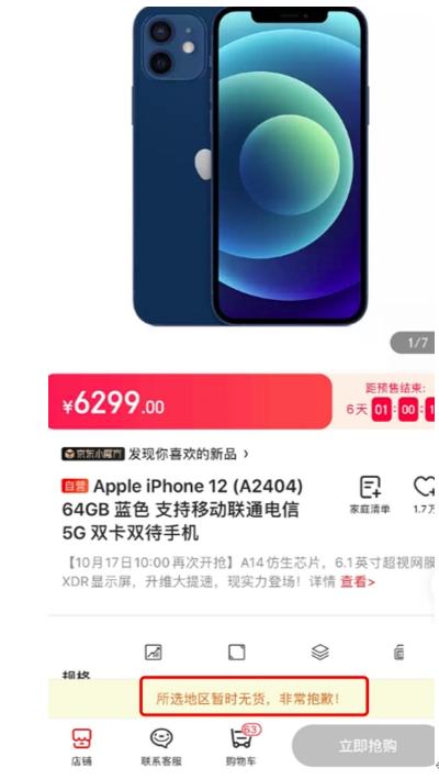 其次在第三方平台方面,京东上iPhone 12、iPhone 12 Pro两款开售机型的全部SKU在开售后的数秒内宣告售罄,天猫旗舰店的备货量看似多一些,但也只是撑了不到10分钟,20点10分之后多个SKU陆续宣告无货,而iPhone 12 Pro更是早早进入"售罄"状态。