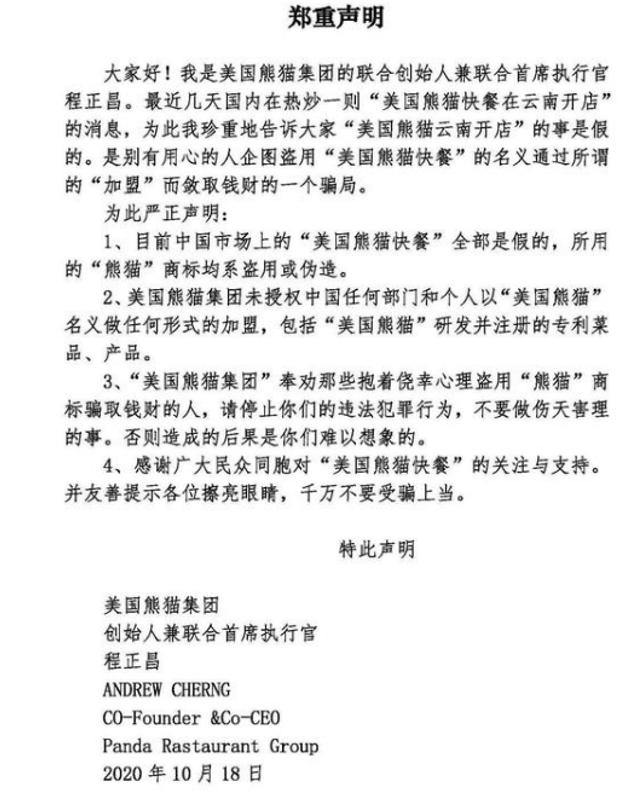 10月19日,中国烹饪协会官网发布一则声明,就近日大众关注的"美国熊猫云南开店"一事进行了回应,声明中称,"美国熊猫云南开店"的事是假的,是别有用心的人企图盗用"美国熊猫快餐"的名义通过所谓的"加盟"而敛财的一个骗局。