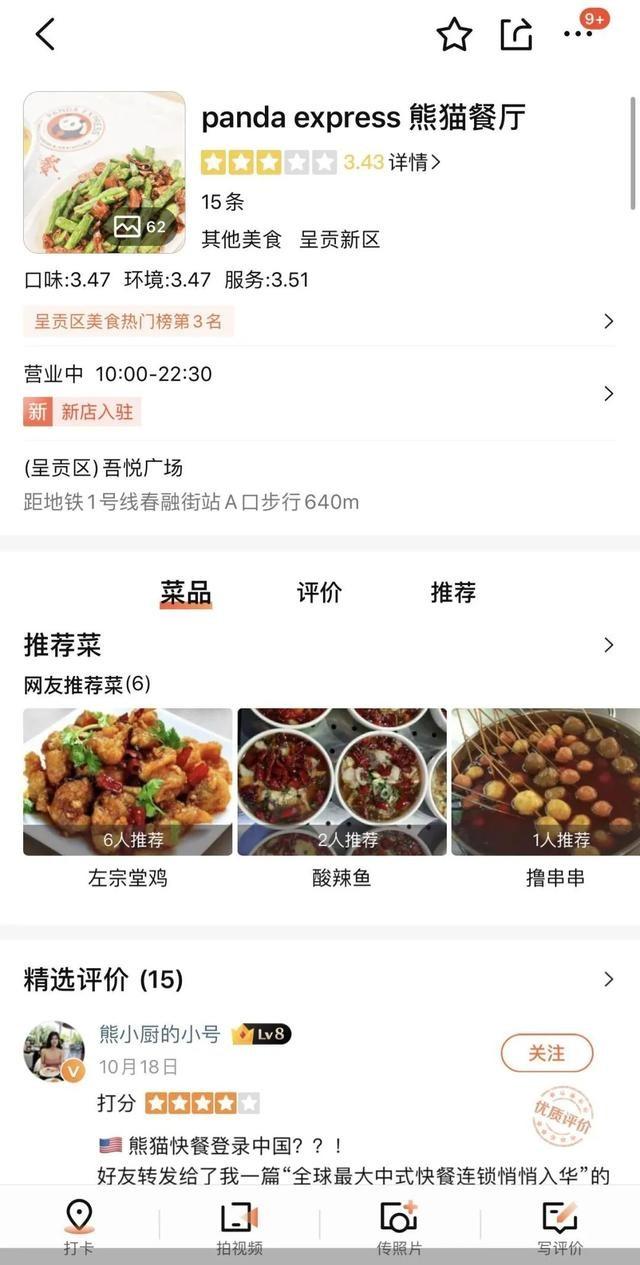 熊猫餐厅声名在外,在全美各个城市可以看到其标志性的红底熊猫LOGO,菜单中的陈皮鸡、左宗棠鸡、宫保鸡丁等也成为了美国人对中餐的主要印象,从大众点评上消费者拍摄的这家新开的"冒牌"熊猫快餐来看,其餐厅标志与美国的熊猫餐厅一致,菜单中也有其标志性的左宗棠鸡、陈皮鸡等,同时也增加了更具本土特色的串串。