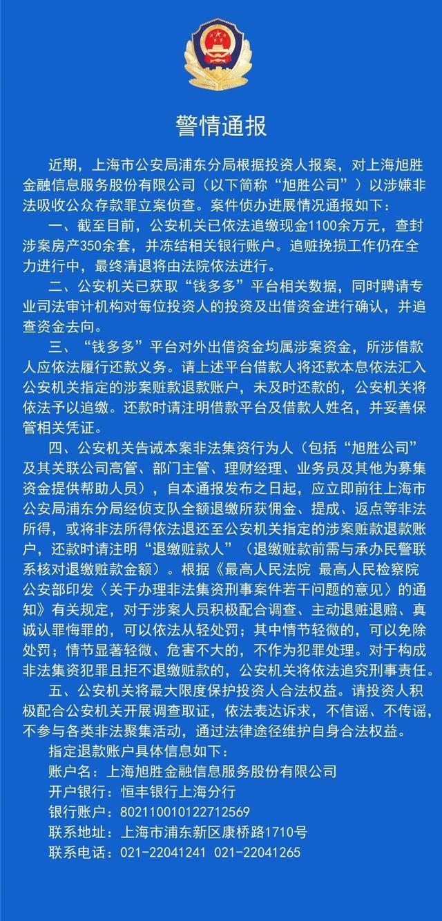 10月21日,上海市公安局浦东分局发布警情通报称,上海旭胜金融信息服务股份有限公司(以下简称"旭胜公司")因涉嫌非法吸收公众存款罪被立案侦查,而旭胜公司运营的P2P网贷平台名为"钱多多"。