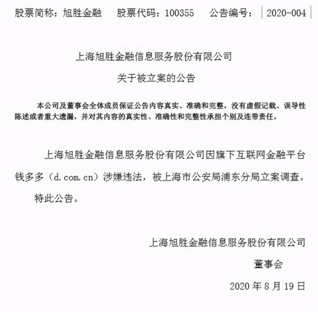 而值得注意的是,早在8月19日,旭胜公司就发出公告称,公司因旗下互联网金融平台钱多多涉嫌违法,被上海市公安局浦东分局立案调查。