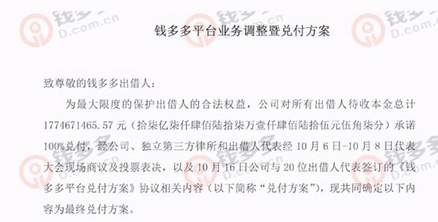 同年10月18日,在宣布暂停业务的一个月后,钱多多发布《平台业务调整暨兑付方案》,提供现金兑付方案,不动产兑付方案以及特殊兑付方案,特殊兑付方案又包括债权转让、小额优先兑付、逾期和展期的待还本金和利息三种,并承诺将完成全部待收本金约17.75亿100%兑付,兑付期限为21个月,到2020年7月15日为止。
