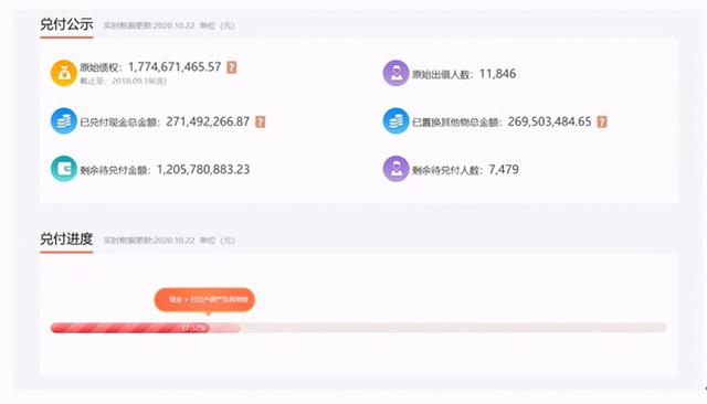 如今,从钱多多平台网站上看,离其承诺兑付金额17.75亿元金额相差甚远,据其网站显示,截至2020年10月22日,平台已兑付现金总金额为2.71亿元,已置换其他物总金额为2.7亿元,平台剩余待兑付金额12.06亿元,剩余待兑付人数7,479名,兑付进度仅为17.52%。