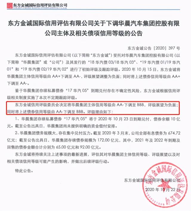 不仅如此,华晨集团更是被多家评级机构连续多次下调信用等级,8月,大公国际和东方金诚先后将华晨集团及其多只债券列入评级观察名单;9月,东方金诚和大公国际均调低了华晨集团的主体信用评级,其中东方金诚调低至AA+,大公国际直接调低至AA;10月16日,东方金诚再次将华晨集团的主体信用评级调低至AA-。