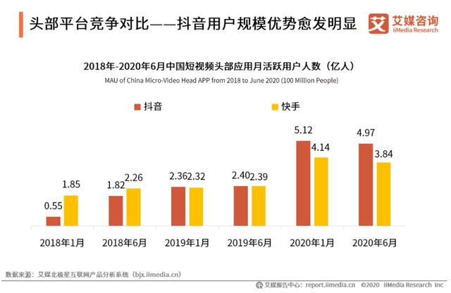 根据艾媒资讯统计,2019年抖音月活跃用户数超过快手后,二者间差距就越拉越大。