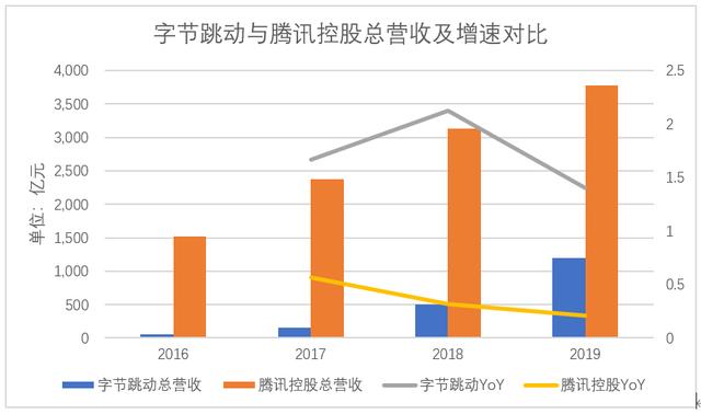 字节跳动绝对收入惊人,却比其一直追赶的竞争对手腾讯还差一截。腾讯控股发布的公告显示,2019年腾讯控股全年收入约3773亿元,而2020年上半年,腾讯收入就已经超过2000亿元。