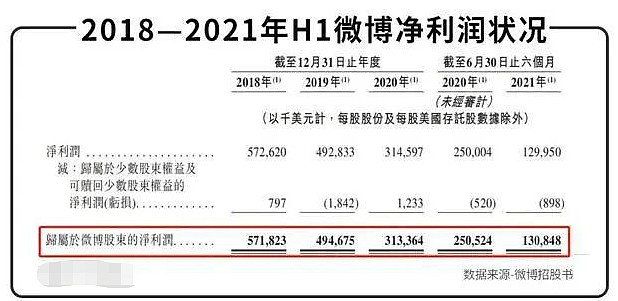 但是总营收的增长并没有带来净利润的增长。根据招股书数据可知,近三个完整财年,微博净利润分别为5.72亿美元、4.95亿美元、3.13亿美元,呈不断下滑趋势。2019年同比2018年下滑13.5%,2020年同比2019年下滑37%。而2020年是疫情最为严重的一年,这一年众多社交类平台的营收和净利润是净增长的,微博净利润下滑近四成,让很多投资者大感意外。