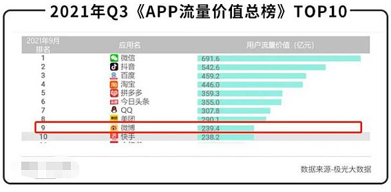 2021年上半年,根据QuestMobile数据的统计,在媒介行业广告收入占比里,短视频占比最高,达到42.6%,其中抖音以30.2%位列第一,微博社交占比下滑到1.7%,竞争力逐年下跌,已是事实。在极光大数据发布的2021年三季度《APP流量价值总榜》中,微博以239.4亿元的用户流量价值,仅位列第九,而微信和抖音分别以691.6亿元和542.6亿元占据前两名,微博和前两名的差距巨大,短期内不仅难以缩小差距,还恐将被进一步拉开距离。更让微博有危机感的是,另一短视频巨头快手的用户流量价值为238.2亿元,距离微博仅有一步之遥,随时有被快手反超的可能。