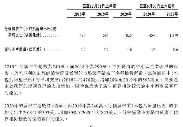 尽管微博原来越依赖广告营收,却无力改变广告主逐渐减少的无奈事实。2018年微博的广告主数量为290万,2019年为240万,下滑了17.2%,而2020年受困于疫情影响,广告主数量跌至160万,跌幅为33.3%。2021年前三季度广告主数量为80万,和去年同期相比减少了60万,跌幅为43%。