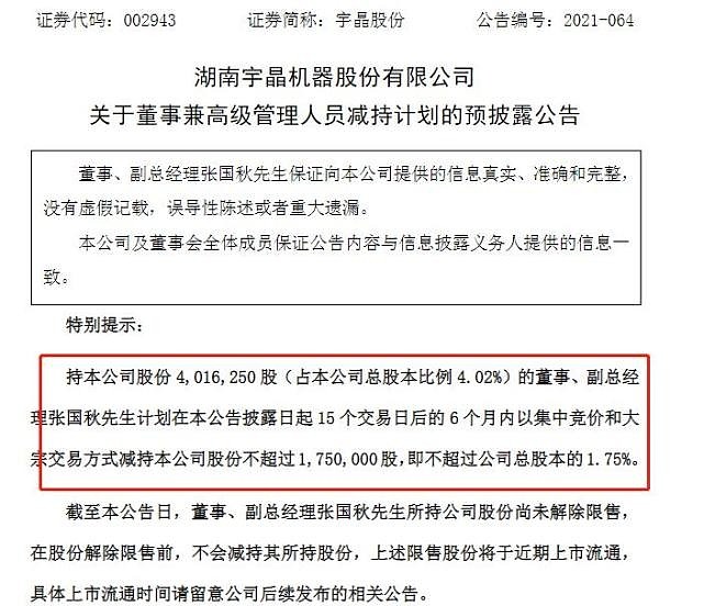 高股价容易产生高管减持套现,此事在宇晶股份身上同样上演,而在股价暴涨期间,出现了董事、副总经理张国秋,以及董事罗群强的减持计划,此计划分别11月9日和11月11日公告公布,其中张国秋累计减持87.42万股,罗群强累计减持70.62万股。