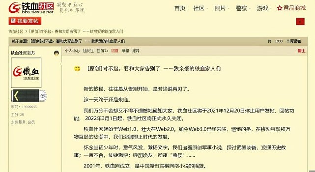曾经是军迷最重要的聚集地、有着20年历史的铁血社区即将永久关闭。