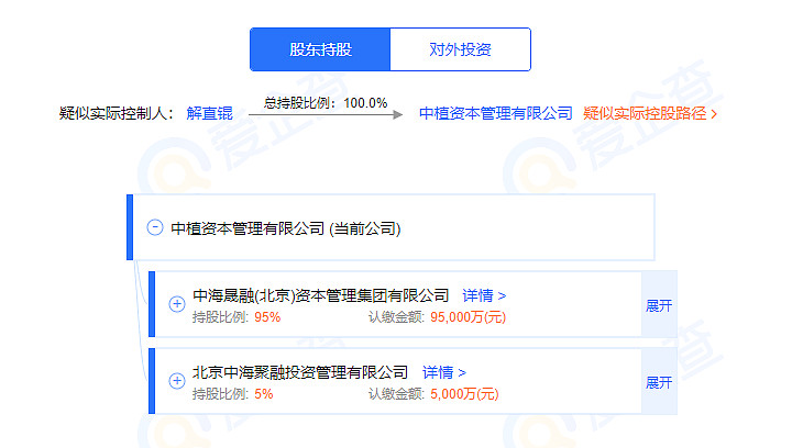 中植资本的主要发起方仍然是中海晟融,持股占比95%,穿透之后的受益人和实控人也是解直锟本人。