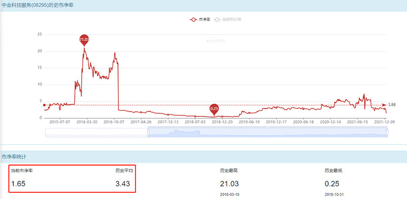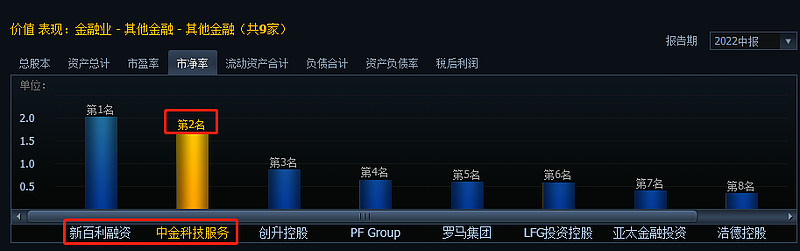 如下图,在价值表现上,对比其他公司,市净率排名第一的是新百利融资,目前是2.01,排名第三的创升控股是0.86,占据第二位的中金科技服务,数据上显然高过后面一大截,稍低于第一位。