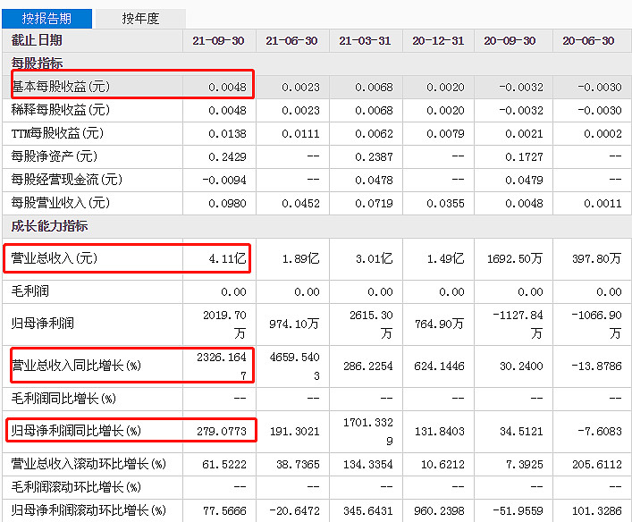 中金科技服务发布的2022财年中报。截至2021年9月30日止六个月,基本每股收益为0.0048元。2021年4月1日-2021年9月30日,公司营业收入4.11亿元,同比增长2326%,归属母公司净利润2019.70万元,同比扭亏为盈,去年同期亏损1158.80万元。